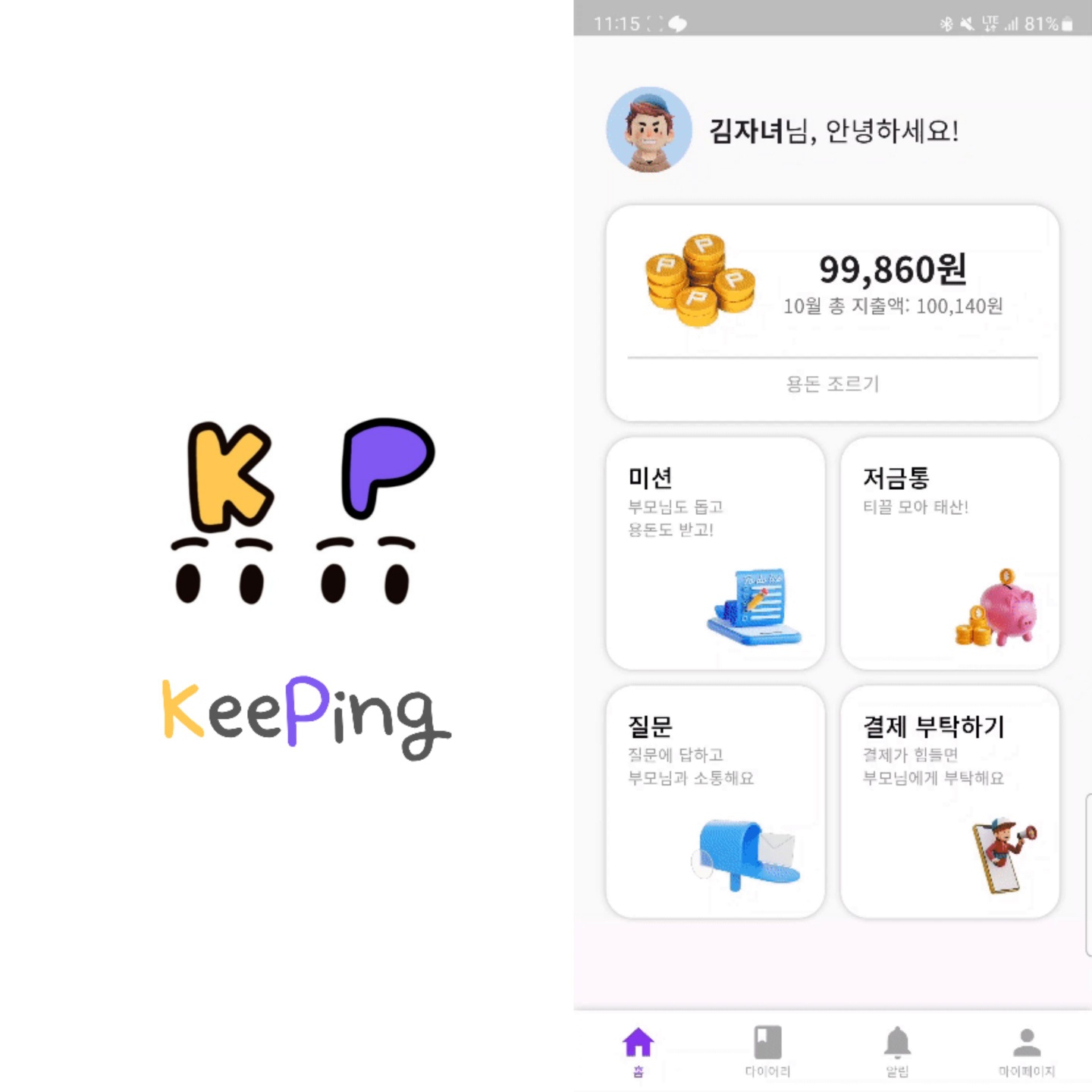 결국 우리 팀은 용돈 미션을 통해 아이들이 즐겁게 돈을 모으고, 소비 내역을 되돌아 볼 수 있는 질문으로 소비 습관을 고민해볼 수 있는 어린이를 타겟으로 한 용돈 기입장 KeePing을 기획했다.