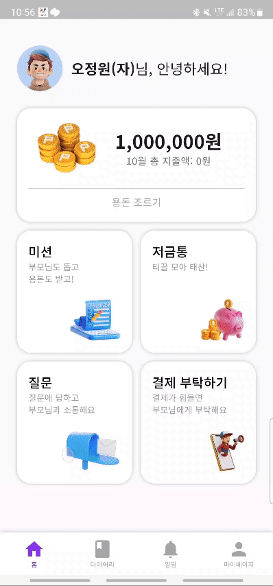 기획 과정에서 많은 시간을 투자한 만큼 다양한 아이디어를 뽑아냈는데, 내가 기획한(프로젝트에 쓰이지 않았던 기능마저도!) 기능들이 카드사 / 은행에서 사용하고 있다는 것을 확인했을 때 정말 즐거웠다.(친환경 소비와 구매내역의 연결 등) 또한, 앱의 핵심 기능(아이가 질문을 받고 답변하며, 부모가 이를 통해 소통할 수 있는 질문 기능) 기획에 크게 기여했다는 점, 서비스의 이름부터 슬로건까지 전부 내 손에서 탄생했다는 점 또한 서비스에 애정을 가지게 되는 요소가 되었다!